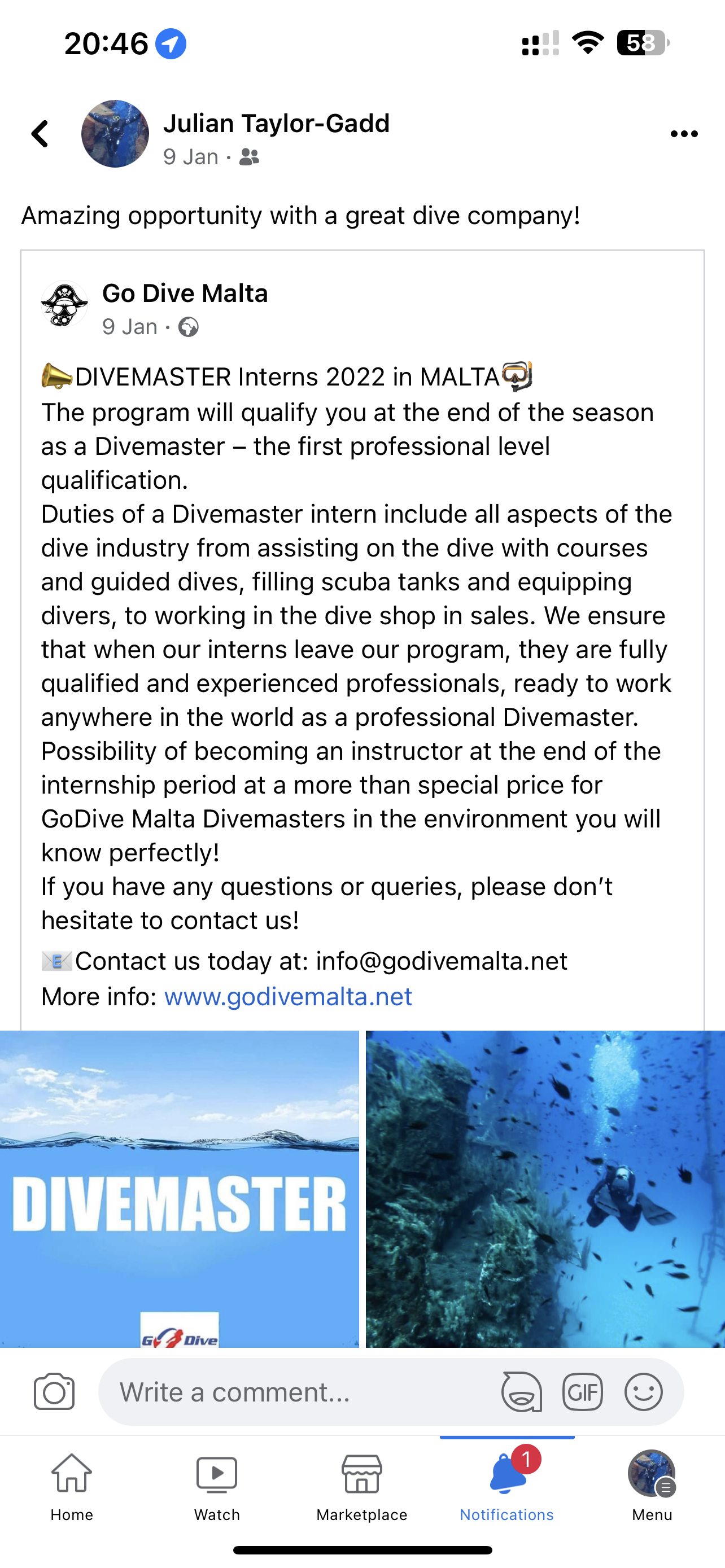 Great opportunity for anyone interested in a career in diving - have dived for many years with Go Dive Malta, and they’re a great fun dive company, with safe diving combined with a fun attitude.